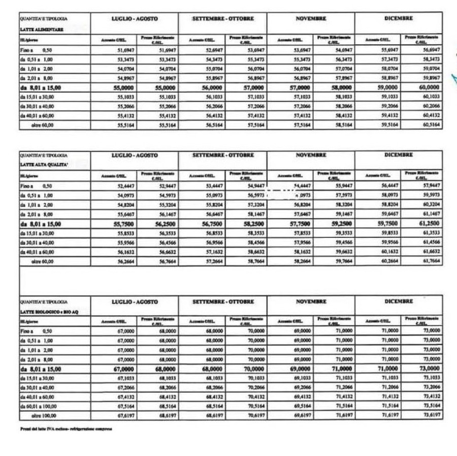 Anche Granlatte aggiorna il prezzo del latte: il latte alimentare dell’area Nord verrà pagato con un acconto, Iva esclusa, di 55 centesimi a litro a luglio e agosto e 56 centesimi a settembre (rispetto a un prezzo di riferimento di 57 centesimi). L’acconto sale a 57 centesimi a litro a novembre (a fronte di un prezzo di riferimento di 58 centesimi) e a 59 centesimi in dicembre (a fronte di un prezzo di riferimento di 60 centesimi). Adeguamenti anche per il latte ad alta qualità e biologico come da tabella sottostante.